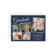Modern vykortsinbjudan för mörk blått studentfest med 5 fotokollage, "Student" i ett elegant vitt skript och gradens namn, skola- och klassår i enkel vit typografi. Lägg till din party-information på baksidan.