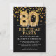 Modern svart och guld överraskar födelsedagsfest inbjudan för någon som vrider åttio! Med en svart bakgrund, faux guld glitter konetti, guld 80-årsballonger och en elegant födelsedagsmall som är enkel att anpassa.