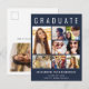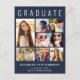 Modern mörk blått studenten-kungörelse för att fira graden "STUDENT" överst i stor vit typografi, en sjudfärgad fotocollage och deras namn, klassår och skola i enkel vit typografi på framsidan. Lägg till ytterligare ett foto och ett anpassningsbar på baksidan.