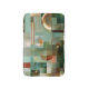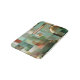 Bath mat featuring a modern abstract design inspired by the Bauhaus style in green, teal and gold.