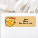 Dessa returetiketter har en modernt abstrakt utformning i mitten av århundradet av en guld-cirkel i en grönt med orange och vitt rand.