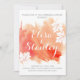 Modern vattenfärgad korallpsig i abstrakt, bröllop-repetitionsmiddagsinbjudan med en handmålad vattenfärg stänk med struktur i ton av korall orange och persika, maple löv i vitt med korallven och text i vitt och grått. Den här inbjudan till bröllopsmötet för elegant och snyggt avslappnad en fullständig perfekt av anpassadet för bröllop vår, sommar eller fall/höst. Observera att detta bara är en vattenfärgsbild och inte en riktig struktur. För bästa resultat, välj filt eller annat pappert.