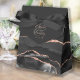 Denna eleganta moderna presentlåda har en svart akvarell agatdesign kantad med rosenguldfärgade glitter. Personifiera den med brudens och brudgummens namn i rosaröd handskriven stil ovanför ett stort grått et-tecken, tillsammans med bröllopsdatum nedan.