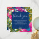 Denna blomstermönstrade och botaniska bröllopsdusch tack-kort har akvarellblommor i rosa,lila och persikofärg samt blad i starka gröna nyanser med het rosa bakgrund. En perfekt färgrik blomsterbröllopsinbjudan