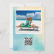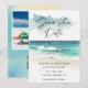 Modern akvarell hav strand foto spara datum - En vacker, akvarell Spara datum med turkost hav och vit sandstrand. Baksidan av Spara datum har ett foto av det lyckliga paret och en QR-kod som leder till er bröllopswebbplats.