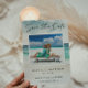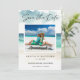 Modern akvarell Ocean Beach Två bilder Spara datumet - En vacker, akvarell Spara datumet-kort med en turkos ocean och vit sandstrand. Ditt vackra foto visas både på framsidan och på baksidan av inbjudan. Baksidan av inbjudan har också en QR-kod som dina gäster kan skanna för att komma till din bröllopswebbplats.