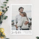 Den här enkla, moderna fotokortmallen med snyggt bröllop spara datum innehåller namn och datum under fotot. Skriptet Save the Date i svart på framsidan är en bild som inte kan ändras. Du kan välja att ändra teckensnitt, interpunktion eller färg som används för olika andra inslag av den här designen framifrån och/eller bakåt. Du kan t.ex. välja att ge ett visst färg till viss text eller att ta bort något eller ändra en text fält helt och hållet med ett annat meddelande. Eller så kanske du föredrar en annan formulering för en text, till exempel att ändra "är gifta sig" till "är gifter sig" osv. På båda sidor har vi satt bakgrunden som öppen, så att färg i pappra helt enkelt blir som färg. Du kan välja ett färg för bakgrunden om du vill. Vi har valt något mjukt svart för namn och dejt på framsidan och en grått-ton för texten på baksidan, men du kanske föredrar ett annat färg. Använda den intuitiva designen verktyg, ditt favoritfoto och din inspiration för att göra den här chicen till en modern minimalistisk mall för bröllop spara datum inbjudan unik!