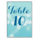 Modern Aqua Blue Bröllop-Bordsnummer Card med bokeh-punkter och cirklar för akvarier eller tealstrande bröllop.