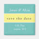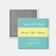 Modern Spara datum magneter-design har en ljusakvabaserad bakgrund med blekens gult "spara datumbandet". Anpassa med parets namn, händelsens datum och plats i modernt vitt teckensnitt.