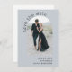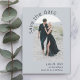 Den vackra enkelheten och den konstnärliga boho stil gör det här moderna bröllop spara datum-kortet till ett attraktivt kort. Det har en ljusformad fotomall på kortets framsida för att överföra det önskade fotot. Det finns en textmall på kortets framsida som kan anpassas till bridens och gruppens namn och planerade datum i bröllop. På baksidan av det här kortet finns ett exempelmeddelande med ytterligare information som du kan anpassa. Det här kortet visas här med en ljusdammig blå bakgrund och finns även i andra färg.