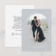 Den vackra enkelheten och artismen i stil gör att den moderna bröllop tack vare kortdesignen med tilltalande drag. Den har en fotomall på kortets framsida som överför det önskade fotot. Det finns en textmall på kortets framsida som kan anpassas till bridens och gruppens datum namn och bröllop. På baksidan av detta kort finns ett provtackmeddelande som du kan skicka som skriven eller personlig använda med din formulering och bruden och brudgummens namn. Visa här i en mjuk blå grått-bakgrund, det här kortet finns även i andra färg.