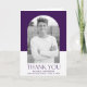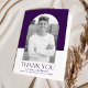 Ett enkelt och snyggt-studenten-tack som du har med dig student-fotot inuti en båge ram med lila och vit färg-blockbakgrund. "Tack" visas i lila med det moderna brevet med student namn, skolan och studenten som visas nedan. Insidan av fotot med tackkortet studenten ger utrymme för ditt skrivna eller handskrivna meddelande.