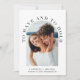 Modern bröllopsinbjudan med ditt foto i en bågformig ram omgiven av "Att ha och hålla kvar" i elegantens typografi. Under fotot lägger du till ditt första namn, bröllop-datum och plats. Anpassa din inbjudan mer detaljerat i enkel typografi på motsatt sida.
