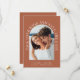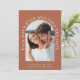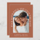 Modern terracotta-destinationsbröllop spara datum meddelande med ditt foto i en båge ram omgiven av "Pack Your Bags and Save the Date" i elegantens vita typografi. Under fotot lägger du till ditt första namn, bröllop-datum och plats. På motsatt sida anpassar du datuminformationen i enkel vit typografi.
