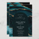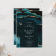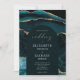 Den här moderna designen har en mörk tealform på en bakgrund av tealvattenfärgad agat som trimmas med guld faux glitter. Ord "bröllop" visas i ett vitt skript i elegant. Anpassa inbjudan med namn till bruden och brudgummen i en kombination av serif- och sans serif-typografi och bröllop-detaljer i kursiv stil.