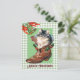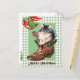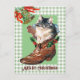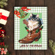 Viktoriansk era ephemera jul hälsning med söt kattunge i en bock och holly, mistletoe-klocka med band, på modern grönt gingham plaid-bakgrund och grymge typografiska julhälsningar med redigerbart budskap, familj namn och adress på baksidan.