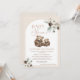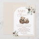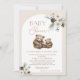 Bohemsk inspirerad baby shower inbjudan med två vinterblomsterarrangemang, en modern kalligrafibild, en båge och en björn och unge i neutrala toner.