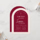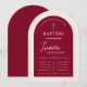 En modern välvd, burgunder och rosafärgad dopinbjudan för flickor. I den övre delen finns ett kors med välvd text ovanför. Förnamnet är skrivet i manus, ovanför efternamnet. Informationen om ceremonin och mottagningen står i två kolumner åtskilda av en linje. Texten, linjerna och den yttre bågens färg är rosafärgad, bakgrunden (den inre bågen) och baksidan är burgunderfärgad.