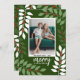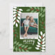 Ett modernt God jul-fotokort i grönt, rött och vitt. Den moderna, abstrakta utformningen inbegriper eukalyptus grenar och bär och sans serif-typ för huvuddelen av texten. Hälsning befinner sig i ett historiskt modernt manus. I baksidan finns en eukalyptus mönster i gröntar och vita.