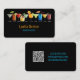 Gör ett bestående intryck med det här affärskortet för bartender-snyggten med en rad färgstarka cocktailillustrationer på en slimmad svart bakgrund. Perfekt för blandologer, evenemangsbartender eller ägare till pub kombinerar det här moderna kortet med fet design med praktisk kontaktinformation och en skannerbar QR-kod. Anpassade namn och information säkerställer att ditt kort är lika unikt och professionell som du är. Perfekt för nätverk vid evenemang, giger eller privat party.