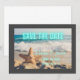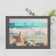 Modern, icke-traditionell strandscen i Spara datum meddelande (som inkluderar vinkar och stjärnfisk i sanden) har fotografibakgrund med Spara datum i vattenblått neon. Mörk grått gräns, anpassa med bröllop parets detaljer.