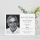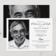 Denna moderna Livets Firande-inbjudan är ett tidlöst sätt att tillkännage en minnesstund eller begravningstjänst med grace och värdighet. Designad med en ren layout och raffinerad typografi, balanserar den elegans med uppriktig enkelhet, vilket gör den till ett genomtänkt val för att hedra minnet av en nära och kära. Framsidan av kortet erbjuder gott om utrymme för att anpassa med viktig information om evenemanget, medan den minimalistiska stilen säkerställer att fokus förblir på den information som betyder mest. Baksidan innehåller ett stort anpassat foto, perfekt för att visa en favoritporträtt, och din närståendes namn och livsdater, vilket gör det möjligt för familj och vänner att vårda en bestående souvenir. Med sin klassiska svart-vita design är denna inbjudan mångsidig och lämplig för alla typer av tjänster, från formella minnesstunder till intima sammankom