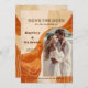 Meddela din speciella dag i tidlös stil med vår moderna Spara datuminbjudan, med ett retrodiagram. Den här inbjudan innehåller ett omhuldat foto och en sofistikerad, bränd orange-återdesign och anger perfekten för firande i bröllop. Anpassa den med din favoritögonblicksbild för att skapa en unik och minnesvärd nyckelroll för dina gäster. Låt dina kära veta att spara datumet i stil med vår Elegant Retro Spara datuminbjudan.