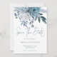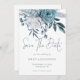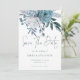 Modern Dusty Blue Blommigts QR Code Bröllop. Fantastiska blommor i blå och vit nyans nyans och ett skript för elegant som anger Spara datum. Resten av texten kan du enkelt anpassa med dina detaljer. Lägg till QR-koden på webbplatsen bröllop på baksidan eller ta bort den och texten på baksidan om det inte behövs.