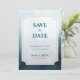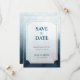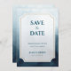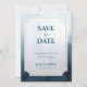 Ett modernt blått Spara datum-kort med en abstrakt men elegant känsla.