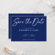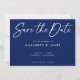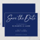 Modern mörkblå bakgrund och vit bröllopsinbjudan i handskriven stil Spara datum. Denna design har stor font i kalligrafisk stil som du kan ändra färgen på. Du kan också anpassa alla detaljer och färger i denna Spara datum-design.