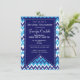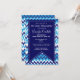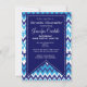 Dessa djärva och moderna blå schevron-inbjudningskort för möhippa har tealturkosa blå och kobolt blå chevron zigzags och geometriska stamstammar med inbjudningskort för möhippan-texten på en blå banderoll. Baksidan av inbjudan är fullt färg med det ljusblå mönstren. Använda den här mallen om du vill lägga till en egen ordalydelse för ett meddelande om modern anpassningsbar möhippa i roligten.