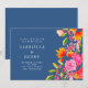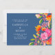 Denna bröllopsinbjudan har en rik blå bakgrund med livfulla, måleriska blommor i rosa, orange och koralltoner. Den färgrika botaniska konsten i kombination med raffinerad typografi skapar en romantisk och förfinad look för en trädgårds- eller utomhusfirande. Ett vackert val för par som älskar djärva, konstnärliga bröllopspapper. Finns tillgängligt i tryckt version eller som en direkt digital nedladdning.