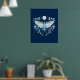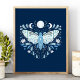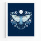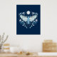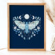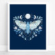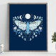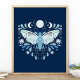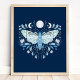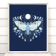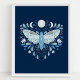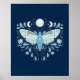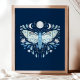Modern Blå Och Vit Abstrakt Celestial Fjärilsillustration Affisch. Denna magiska mystiska abstrakta boho-design har en vacker invecklad fjärilsillustration med fullmåne och halvmånefaser. Prydd med vilda blommor och blomsterutsmyckningar. Bohemisk häxlik estetik.