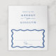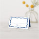 Lägg till en stilren touch till din bröllopsmottagning eller speciella händelse med dessa moderna vågiga ram bröllopsplatskort! Den retrodesignade designen visar "Bord" i en handskriven blå stil med utrymme för dig att skriva din gästs namn och bordnummer. En blå vågig kant omger designen som kontrasterar mot en vit bakgrund. Baksidan av det vikta platskortet visar era namn och bröllopsdatum i fet vit bokstav.