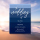Modern blå vågstrimmig kalligrafi strandbröllop inbjudningar