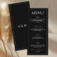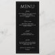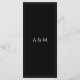 Modern and simple wedding menu in black and white. Clean and easy-to-read design that matches a minimalist modern wedding theme. Includes course description - starter, main course, desert and drinks information which is easy to edit and personalize.