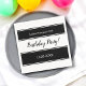Den här eleganten svart och vit Napkin är perfekt för en modern födelsedag. Den enkla designen har en slimmad svartvit kalligrafi på en svartvit, rand bakgrund.