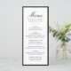 This wedding menu features “Menu” displayed in elegant black calligraphy script with the couple’s names, wedding date, and menu selections arranged below in refined serif lettering. A bold black border frames the design, creating a clean and structured presentation that feels timeless and sophisticated. The balanced layout offers a polished way to showcase your reception courses, making this menu card ideal for modern, classic, and formal wedding celebrations. Personalize the text to create a cohesive table detail that complements an elegant wedding setting.
