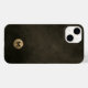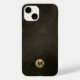 Enkelt Modern borstad metallisk Guld monogram Emblem Distress Leather Struktur Telefonväska. Elegant borstat metallemblem i guld monogram med monogrammet i modern typografi på en tryckt bakgrund av läder struktur i nyanser av svart kastanjbrun.