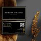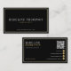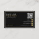 Det här affärskortet har en slimmad svart bakgrund med elegant dubbla-line guld white gräns. På framsidan visas ett centrerat namn i ett fet, vitt serif-teckensnitt, med en guld-rubrik nedan och en minimal webbplatslänk vid grund. Baksidan fortsätter det förfinade temat med namn-lämnat justering - första namn i vitt, efternamn i guld - följt av en mindre rubrik. En QR-kod sitter i det övre hörnet av högerna, medan guld-ikoner parade med vit text på ett enkelt sätt visar kontaktinformation på högerna. Ett guld social-mediefandtag visas vid den grund-lämnat, vilket fyller i professionell- och snyggt-designen.