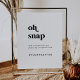 Den moderna svarta typografin Oh Snap bröllop hashtag-skylten är perfekt för ett enkelt bröllop. Den svarta och vita minimalistdesignen har ett retro-ändå-contemporary med en unik rustik bohemisk känsla. Perfekt för alla säsonger. Behållan är minimal, vilket är fallet, eller lägg till egna bilder och teckningar. Anpassa tecknet med hashtaggen i bröllop.
