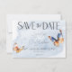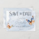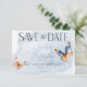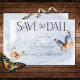 Fånga naturens charm med vårt fantastiska smörflygskort bröllop spara datum. Handmålade vattenfärgade fjärilar ger liv en fängslande visning av rik färg. Vackra toner av beige, varm brun, terracotta-rost, tårblått och grädde skapar en känsla av elegans. Ett mjukt, dammigt blått vattenfärgstvätt ger den perfekta bakgrunden. Den här designen är perfekt för naturens innersta väsen och bjuder in dina gäster att fira din kärlekshistoria mitt i dess skönhet. Skapat av Farmhouse Press.