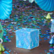 Modern i mitten av århundradet, blommor som utarmats, Julgranar i en silkesfärgad övertoning - träd i skuggor av blek blå och akvarier på en mjuk himlar blå bakgrund