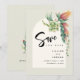 Underbara suckulenter sitter över en välvd infällning och tillför precis rätt touch av färg till denna moderna boho "save the date"-inbjudan. Denna suckulentbukett innehåller blommor från Cotyledon pendens. Under våren och sommaren blommar dessa korallfärgade, klockformade blommor och hänger i spetsen på grenarna. De andra suckulenterna frodas under våren, sommaren och hösten. Din evenemangsinformation i modern, handskriven typografi fullbordar designen. På baksidan drar en annan suckulentbukett uppmärksamheten till tillkännagivandet om en kommande inbjudan. Enkel. Elegant. Perfekt för alla säsonger och bröllopsfiranden.