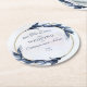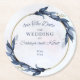 Meddela er bröllop med detta eleganta blommiga inbjudningskort med en cirkulär guldram accentuerad av mörkblå blad och ömtåliga vita blommor. Den minimalistiska layouten kombinerar modern design med tidlös romantik och framhäver era namn och evenemangsuppgifter i förfinade kursiva och serifferade teckensnitt.
