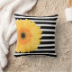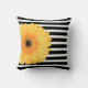 Den moderna blom- dekorativ kudde, djärva svartvita randar beklär och drar tillbaka på, med en vibrerande gul daisy "som av-centreras" på bekläda av kudde.