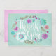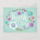 Elegantens tack är designat med teal och lila blommor och ord tack i ett vackert vitt skript. Baksidan av vykortet har en ljus rosa vattenfärg struktur som är tillräckligt lätt för att kunna skriva din egen hälsning. Designad av Blackberry Boulevard.