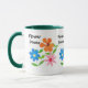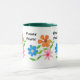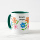 En chic vit kaffe mugg med grönt läpps- och handtag, dekorerad med blommigt av ljusa färgader, från ett handmålat pappert kollage av Judy Adamson.