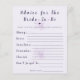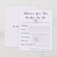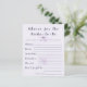 Lägg till en meningsfull och minnesvärd touch till din fest med detta lila boho blommiga ”Råd till bruden” -kort. Designat med mjuka botaniska accenter och modern typografi, uppmanar det gästerna att dela med sig av uppriktiga råd, önskningar och äktenskapstips till den blivande bruden. Perfekt för brud shower, detta eleganta kort blir en souvenir som bruden kan förvara länge efter firandet, fylld med kärlek, visdom och genomtänkta meddelanden från familj och vänner.