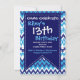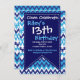 En roligt och fet mönster födelsedagsfest inbjudan eller inbjudan till evenemang, med blått, teal och turkos chevron zigzag och geometriskt mönster. Baksidan har färg mönster-konstruktionen fullt. Den här inbjudan visas som 13:e födelsedagsfest inbjudan, men de här inbjudningsmallarna för söta födelsedagsfester kan enkelt användas för ett barn eller en vuxna, eller kan anpassas för alla typer av party eller evenemang. Fyll helt enkelt i texten med era egna uppgifter om party. Om du vill ändra färg i texten eller ordna om sak, användor du bara knappen "Anpassa". Baksidan av inbjudan har samma färgstarka mönster som framsidan.